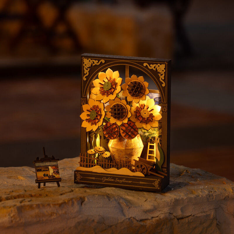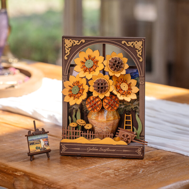 Každý dielik do seba zapadá bez potreby lepidla. Vďaka rotovateľným slnečniciam si môžete výsledný vzhľad prispôsobiť podľa vlastnej fantázie. Súčasťou balenia je aj mini stojan, ktorý dodáva modelu charakter umeleckého obrazu.